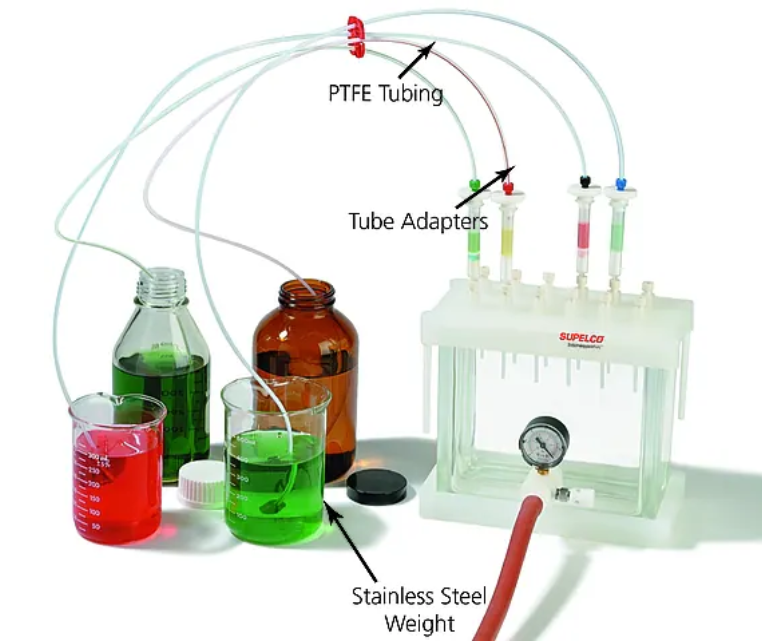 該采樣器包括 1/8 英寸的 PTFE 管,一端有螺紋,另一端有不銹鋼沉子。要使用該采樣器,將配重的一端伸入樣品容器中,直至接觸到底部。將管接頭插入 Visiprep 固相萃取裝置上預處理好的固相萃取柱中。打開到 Visiprep 固相萃取裝置的真空和流量控制閥,樣品將被送往固相萃取柱。每個管的流速可通過流量控制閥來獨立控制。采樣器上的螺紋緊固件和 PTFE 管路都以不同顏色進行區分,以便于樣品識別。